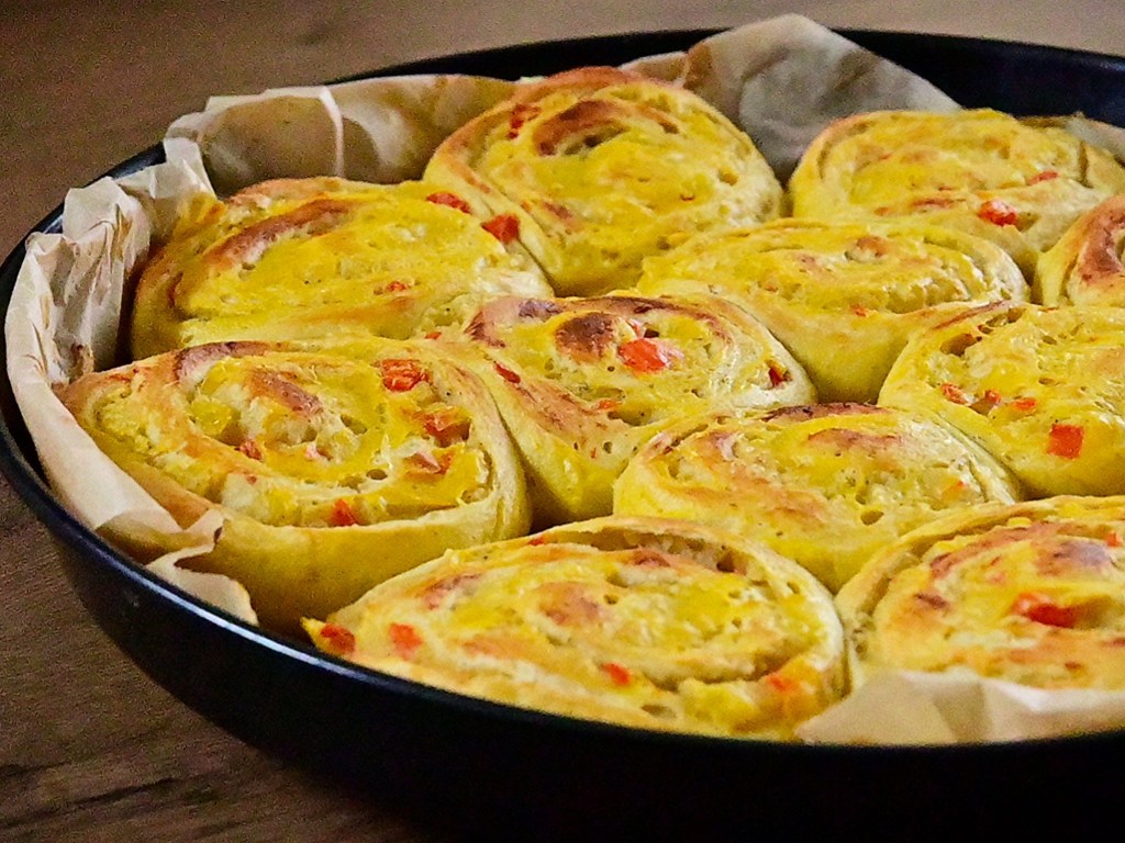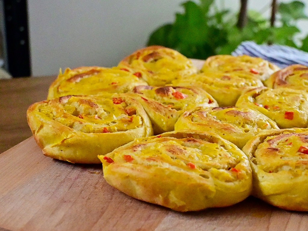 - După ce aluatul a dospit, întindeți-l pe o suprafață ușor înfăinată într-o foaie subțire. Distribuiți uniform umplutura de cartofi peste aluat și rulați-l strâns. Tăiați-l în felii de 1,5-2 cm grosime. Așezați feliile sub formă de melci într-o tavă tapetată cu hârtie de copt. Lăsați melcii la crescut pentru încă 30 de minute. Ungeți-i cu un amestec de iaurt de soia și turmeric (sau smântână vegetală) și coaceți-i în cuptorul preîncălzit la 180°C timp de 35 de minute, până devin rumeni și crocanți.